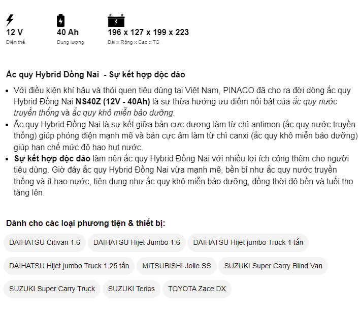 Ắc quy Đồng Nai nước 12V-40Ah (NS40Z)