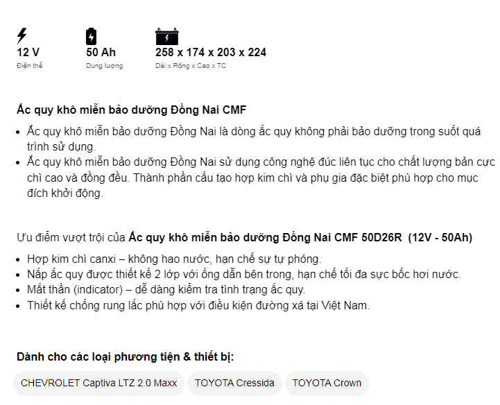 Dòng CMF là ắc quy miễn bảo dưỡng (ắc quy khô, kín) của Đồng Nai đảm bảo về chất lượng cũng như giá thành sản phẩm. Ắc quy làm từ hợp kim chì canxi có bổ sung thiếc, bạc nhập khẩu từ Úc nên không hao nước, hạn chế sự tự phóng điện. Nắp bình được thiết kế 2 lớp với ống dẫn bên trong, giúp giảm tối đa sự bốc hơi nước. Trong bình trang bị bộ phận lọc chống bắt lửa – an toàn khi sử dụng và Indicator (mắt thần) – dễ dàng kiểm tra tình trạng ắc quy.