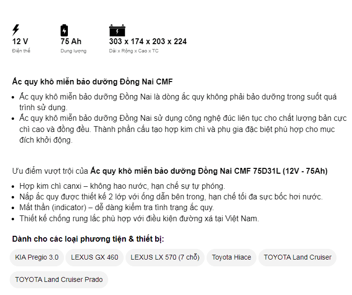 Dòng CMF là ắc quy miễn bảo dưỡng (ắc quy khô, kín) của Đồng Nai đảm bảo về chất lượng cũng như giá thành sản phẩm. Ắc quy làm từ hợp kim chì canxi có bổ sung thiếc, bạc nhập khẩu từ Úc nên không hao nước, hạn chế sự tự phóng điện. Nắp bình được thiết kế 2 lớp với ống dẫn bên trong, giúp giảm tối đa sự bốc hơi nước. Trong bình trang bị bộ phận lọc chống bắt lửa – an toàn khi sử dụng và Indicator (mắt thần) – dễ dàng kiểm tra tình trạng ắc quy.