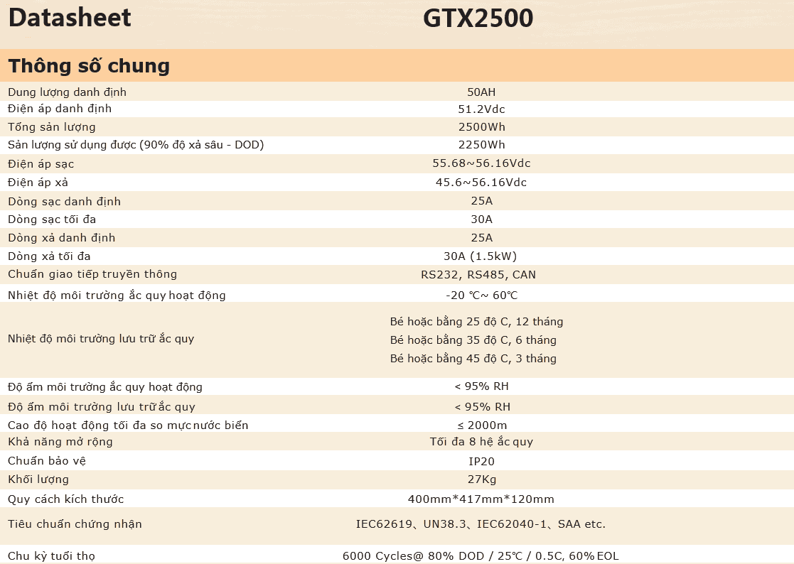 Thông Số Kỹ Thuật Pin lưu trữ Lithium Sofar AMASS STORE BATTERY 48V – 50A (GTX2500)