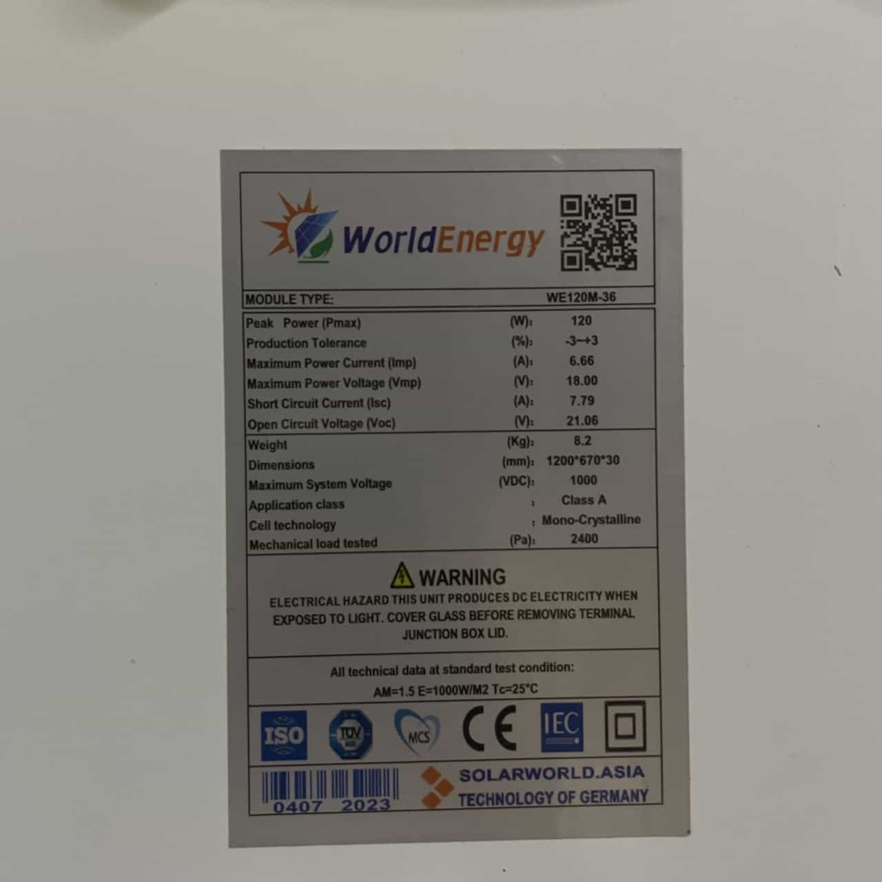ng lượng mặt trời Mono 120W WorldEnergy (Solar panels) đáp ứng tiêu chuẩn chất lượng nghiêm ngặt của IEC, UL, CE, TUV , ETL, PV Cycle, MCS, BBA, Safety class II. Bảo hành hiệu suất 25 năm để đảm bảo hiệu suất tối đa cho hiệu quả hệ thống cao nhất.
