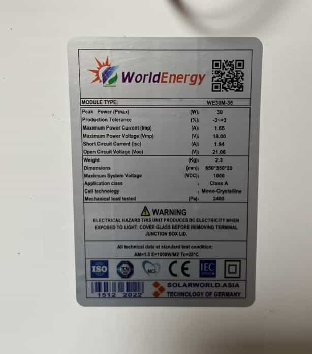 Tấm pin năng lượng mặt trời Mono 30W WorldEnergy (Solar panels) đáp ứng tiêu chuẩn chất lượng nghiêm ngặt của IEC, UL, CE, TUV , ETL, PV Cycle, MCS, BBA, Safety class II. Bảo hành hiệu suất 25 năm để đảm bảo hiệu suất tối đa cho hiệu quả hệ thống cao nhất.